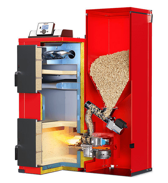 - Wyposażony w palnik pelletowy, spala pellet kazdej jakości A1,A2,B