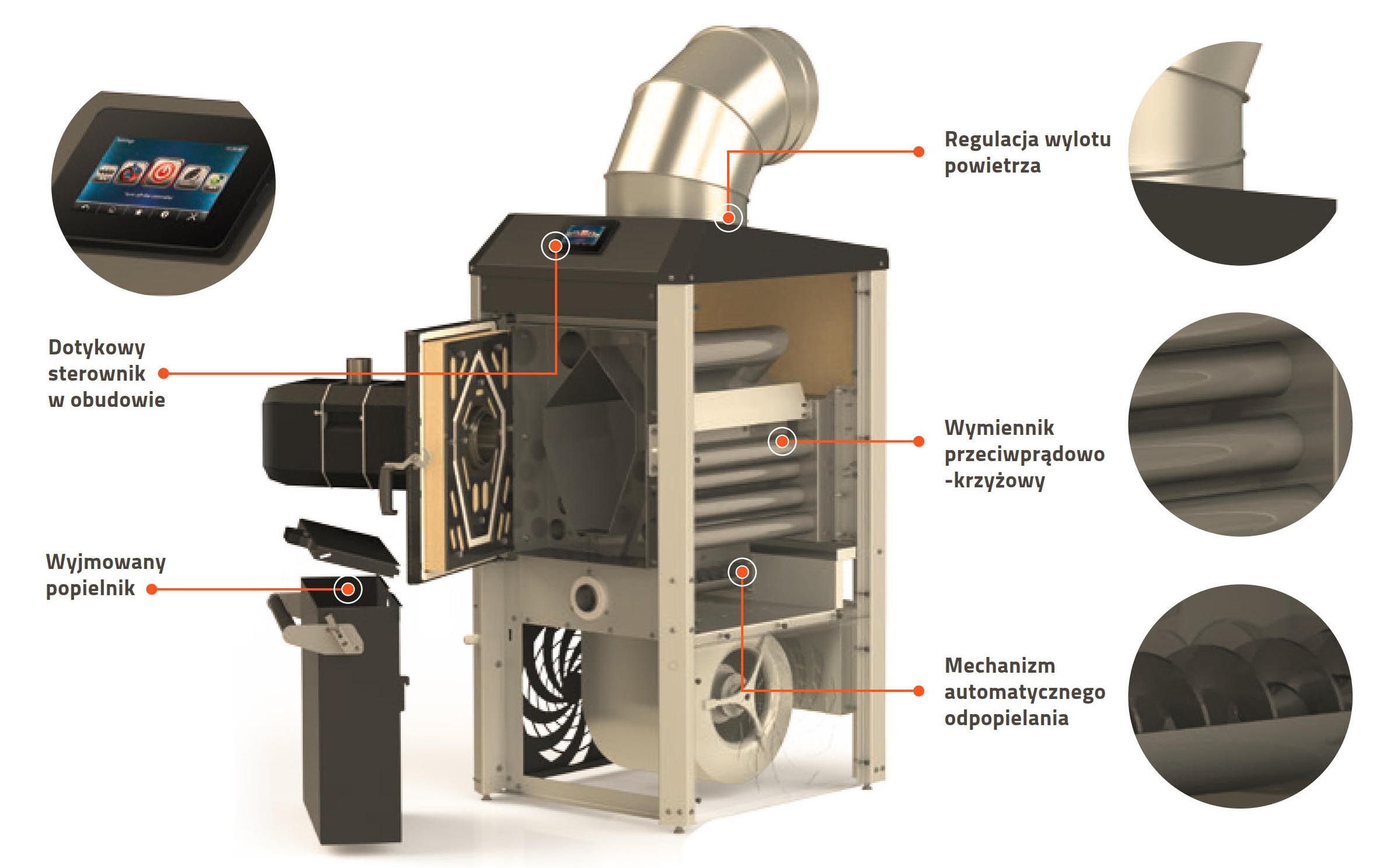 Nowoczesny design łaczy ze sobą najnowocześniejse rozwiązania tj. trzyciągowy, przeciwprądowo-krzyżowy wymiennik ciepła oraz system równomiernego rozprowadzania powietrza przez wymiennik. Skutkiem tego jest najwyższa efektywność w ogrzewaniu powietrza w porównaniu do dotychczas dostępnych na rynku urządzeń.