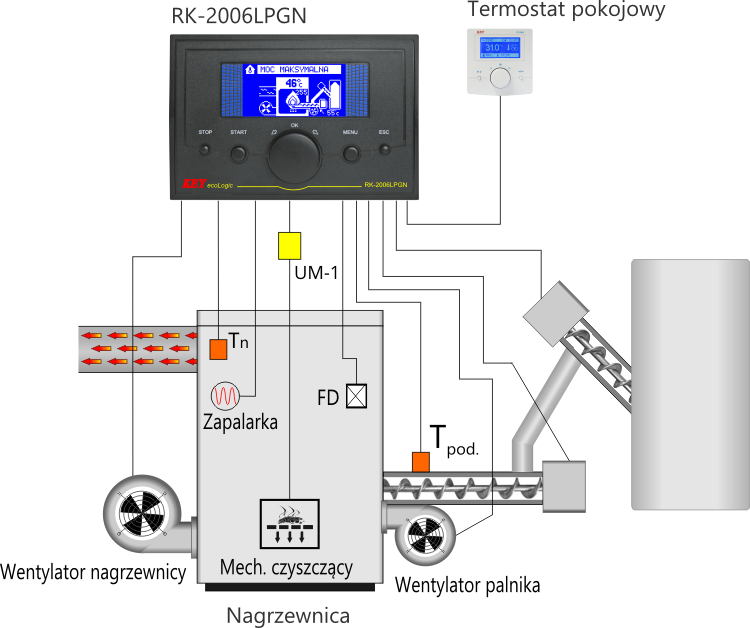 - Czujnik temperatury podajnika — zabezpieczający przed cofaniem się płomienia — pozwalający na kontrolę temperatury podajnika, a w razie przekroczenia zaprogramowanej temperatury uruchamiający proces gaszenia.