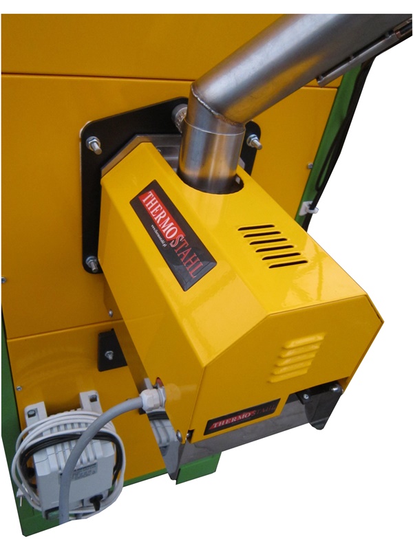 kompletny korpus z obudowami, palnik pelletowy z podajnikiem ślimakowym, system automatycznego czyszczenia (ruchomy ruszt), sterownik, automatyczna zapalarka, zasobnik na pelety 270l