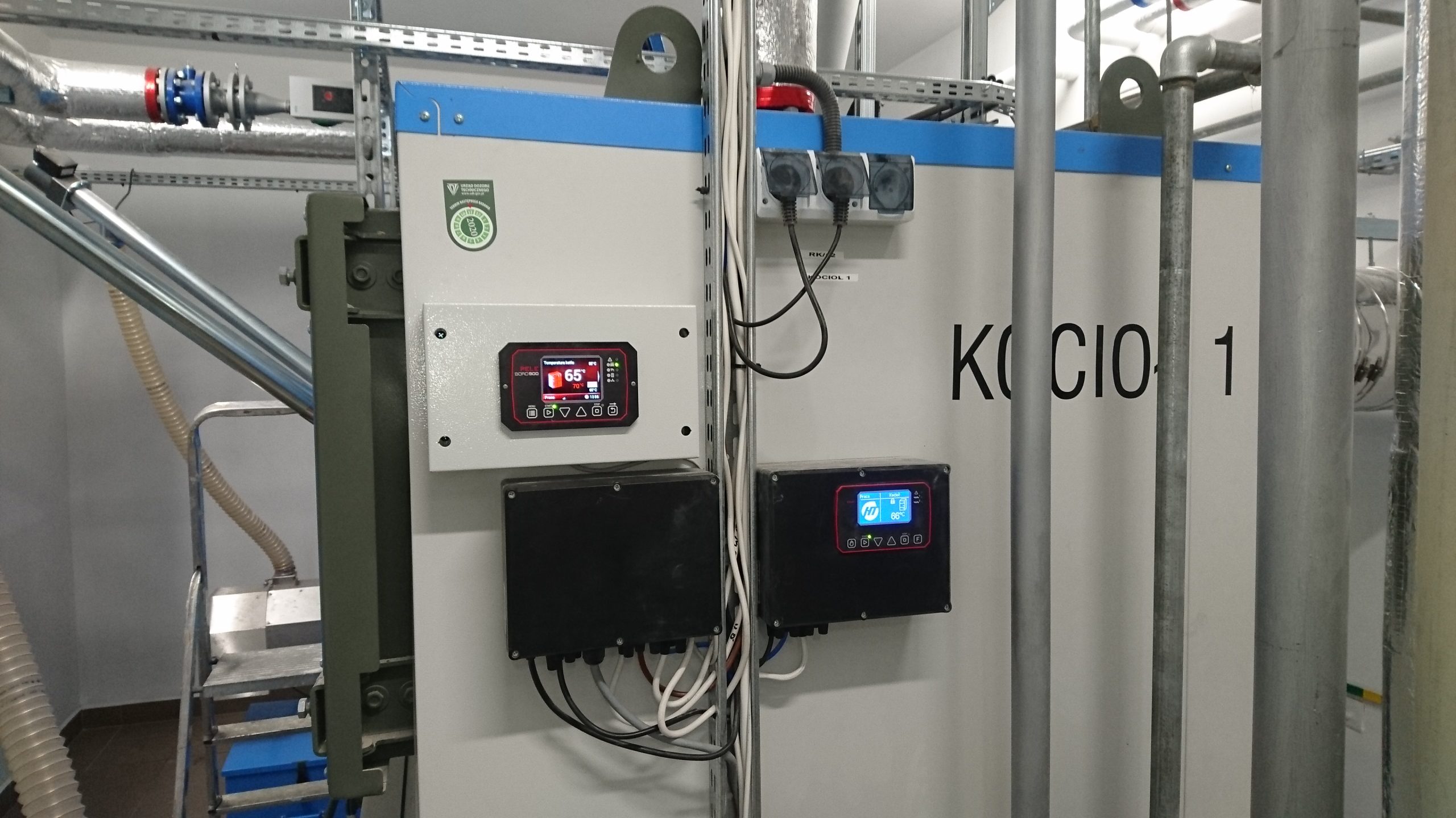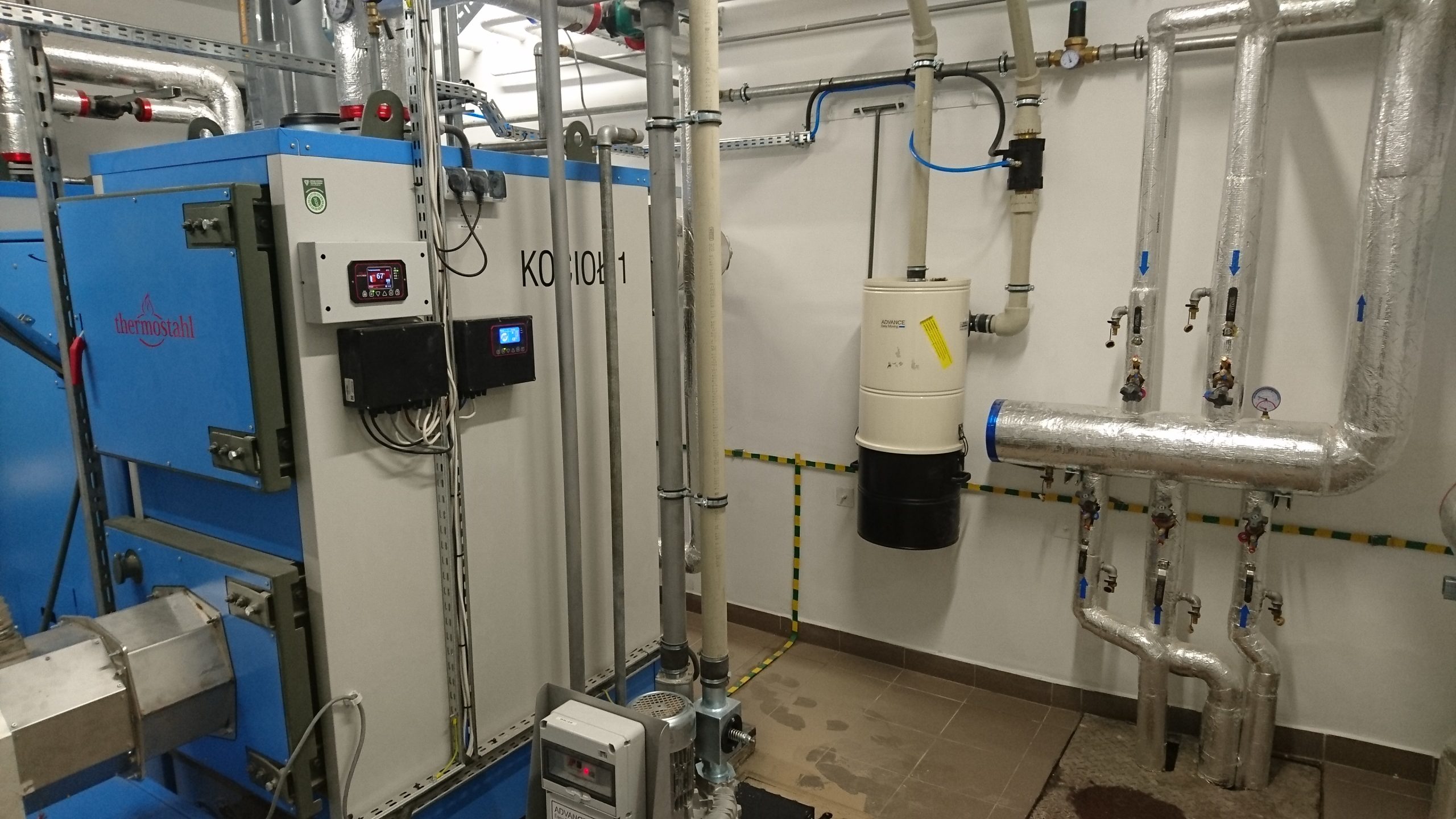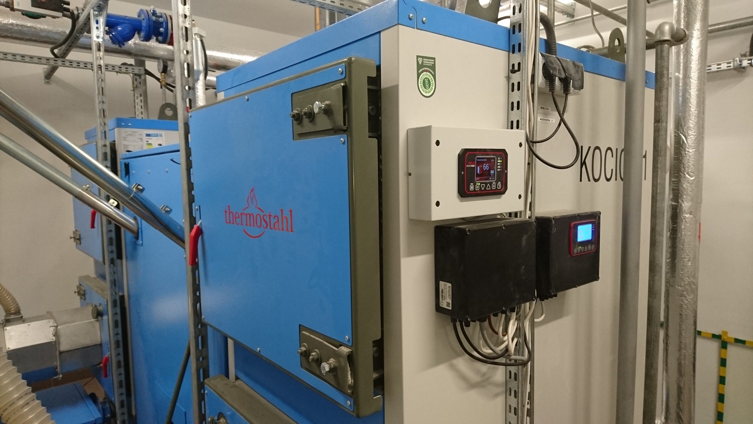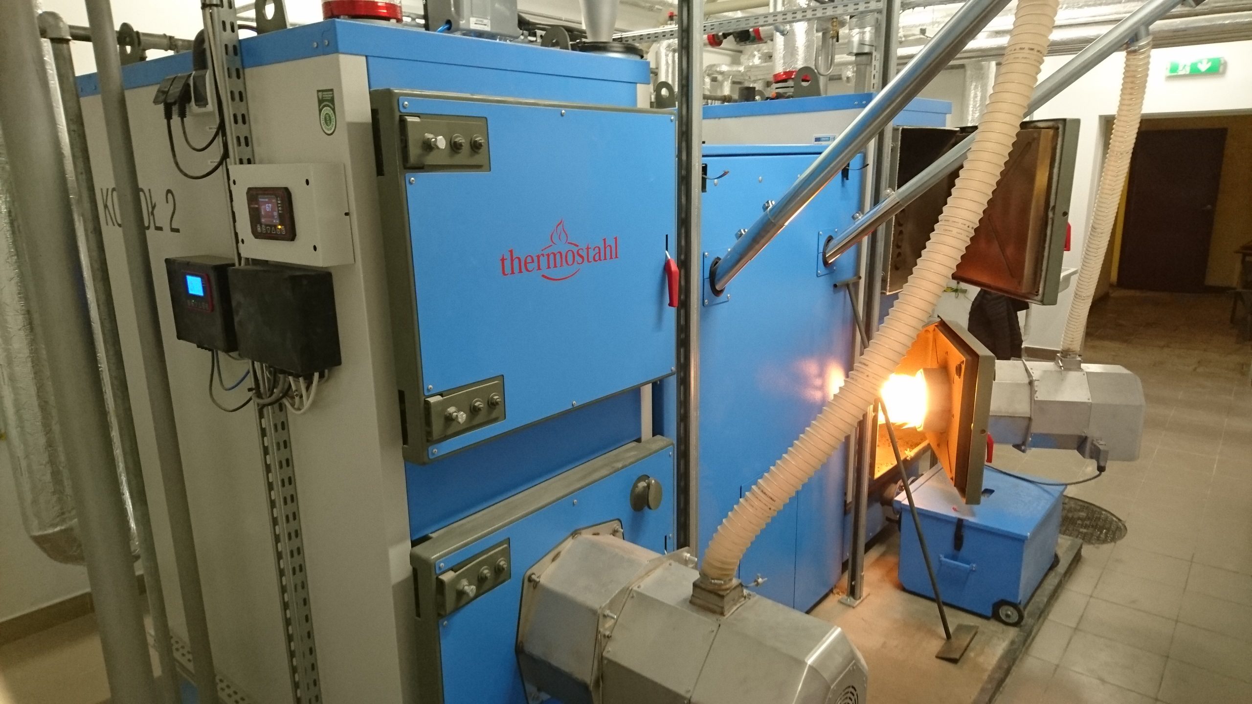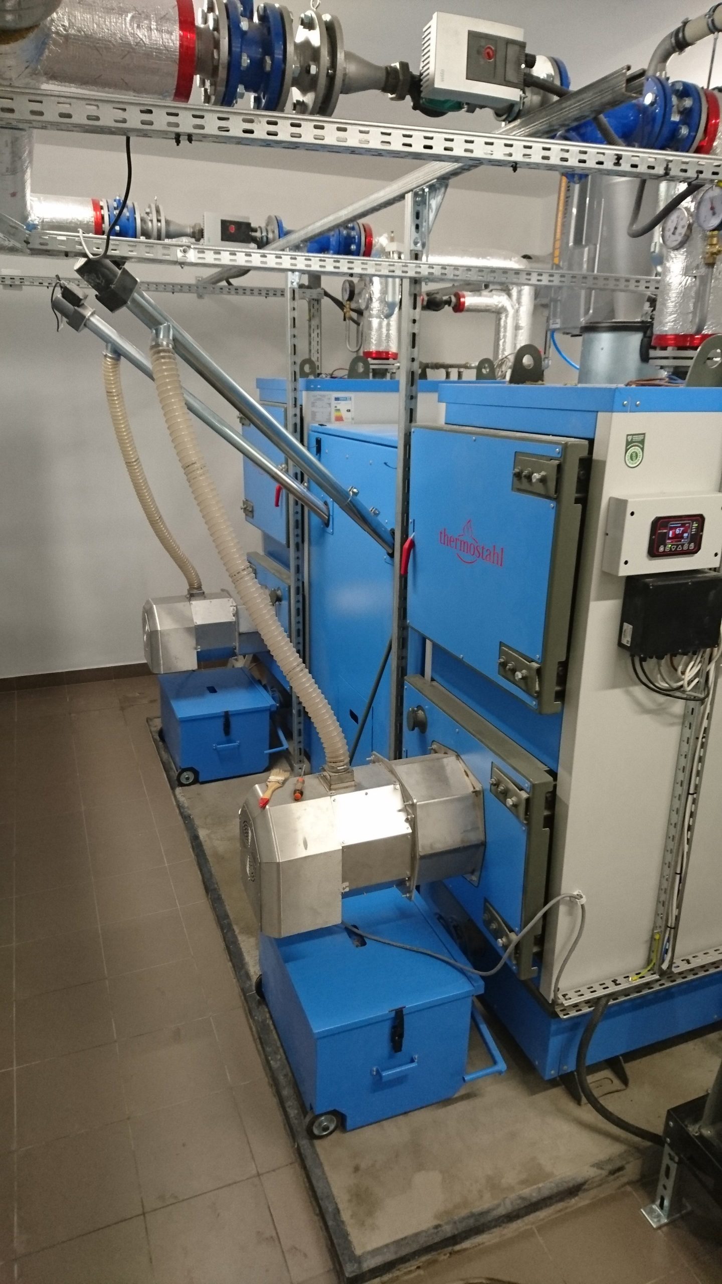 - 2 kotły Thermostahl typ Ekoplex 100kW wyposażone w nowoczesne palniki pelletowe oraz automatyczne odpopielanie